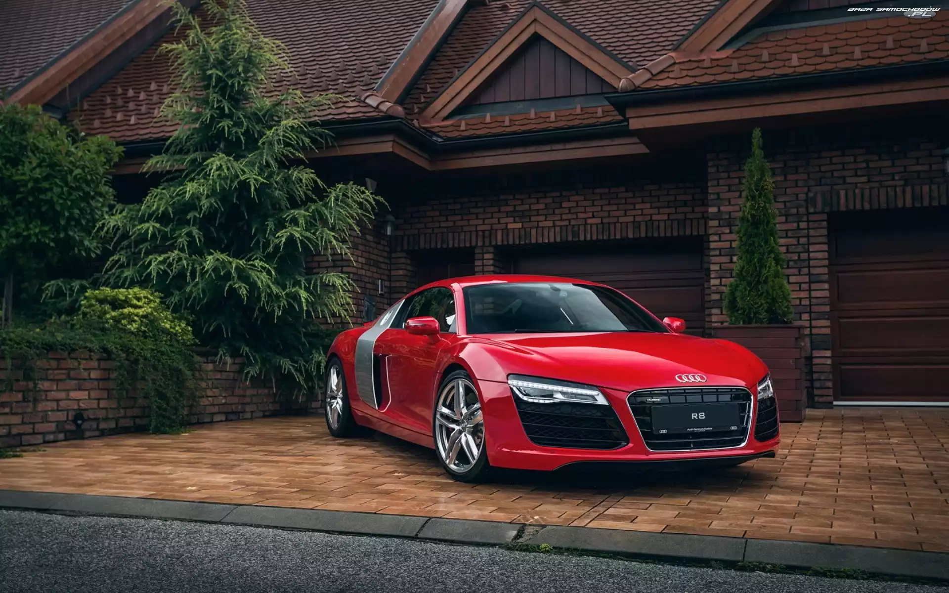 Samochód: Audi, Czerwony, Drzewa, Dom, Samochód, R8
