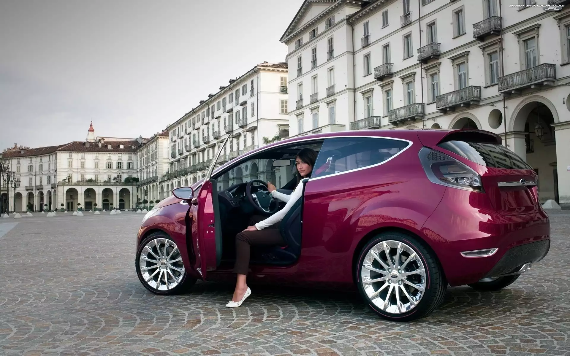 Kamienice, Kobieta, Ford, Bordowy, Verve- Zdjęcia samochodów