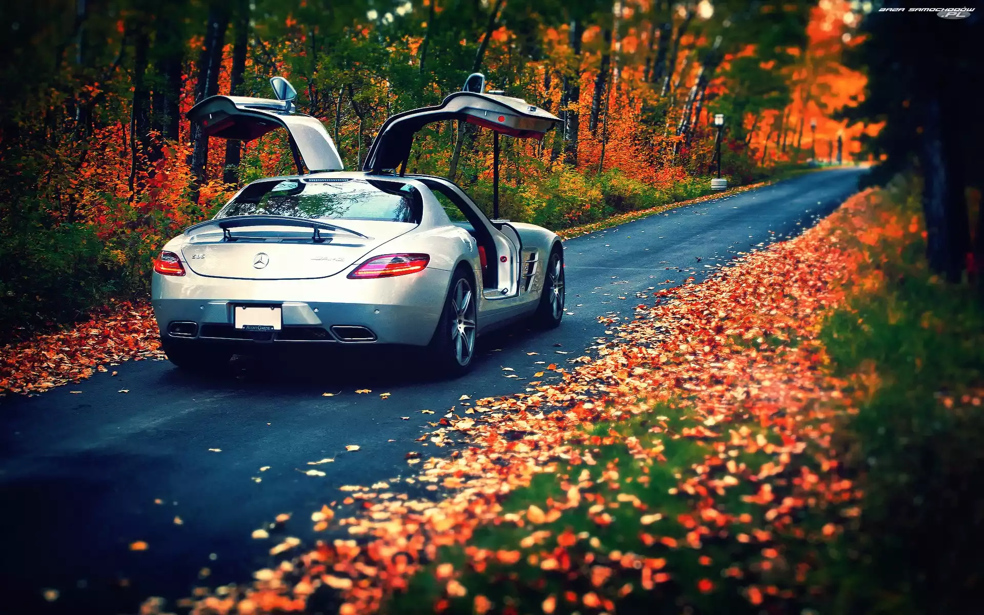 Samochód: Las, Mercedes, Jesień, Liście, SLS, Droga